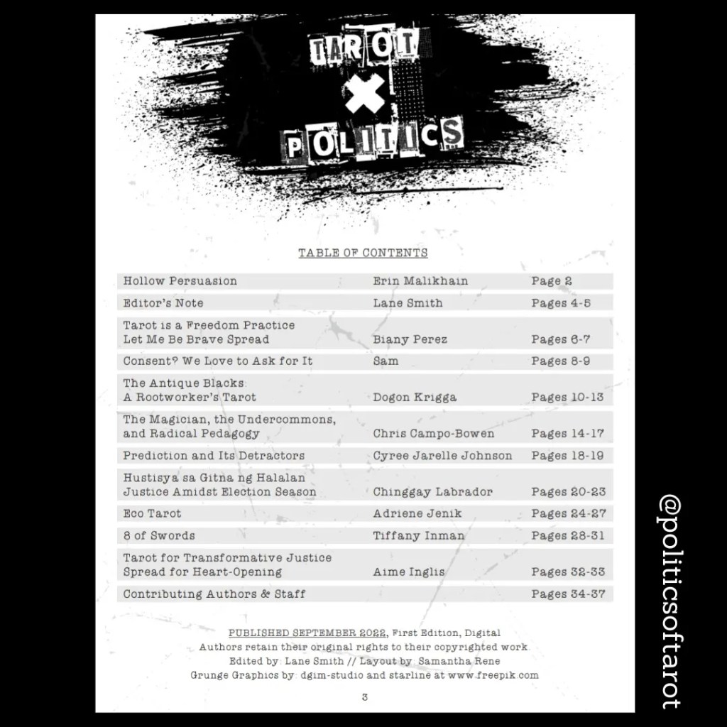Tarot & Politics was created to be a paid venue for Tarot writers and artists, and one that prioritizes the voices of BIPOC, trans, nonbinary, queer, disabled and neurodivergent people. Contributions by white, cisgender, heterosexual, non-disabled, and neurotypical contributors are limited. Submissions open in June of each year, and a flat rate of $50 is paid to each contributor.